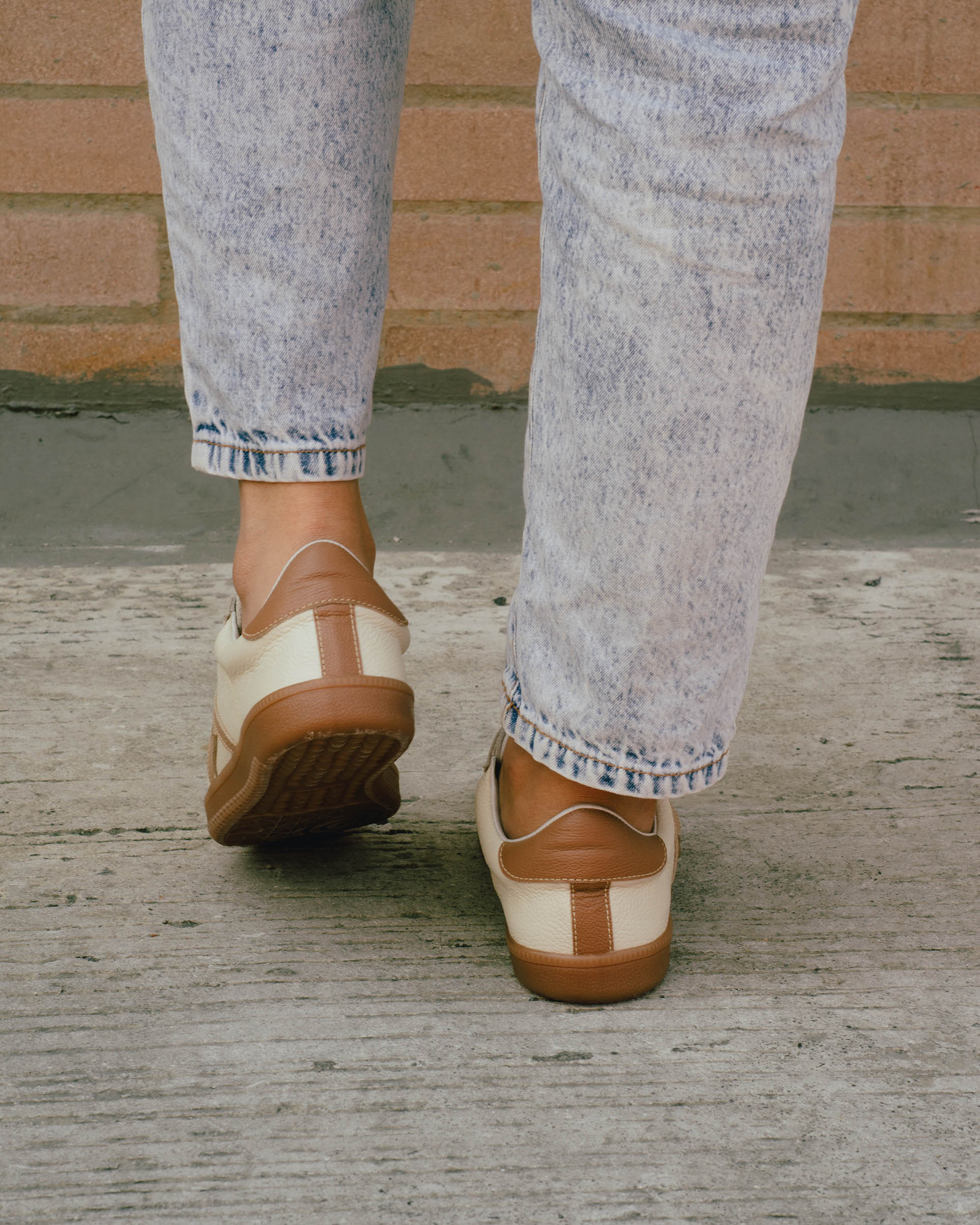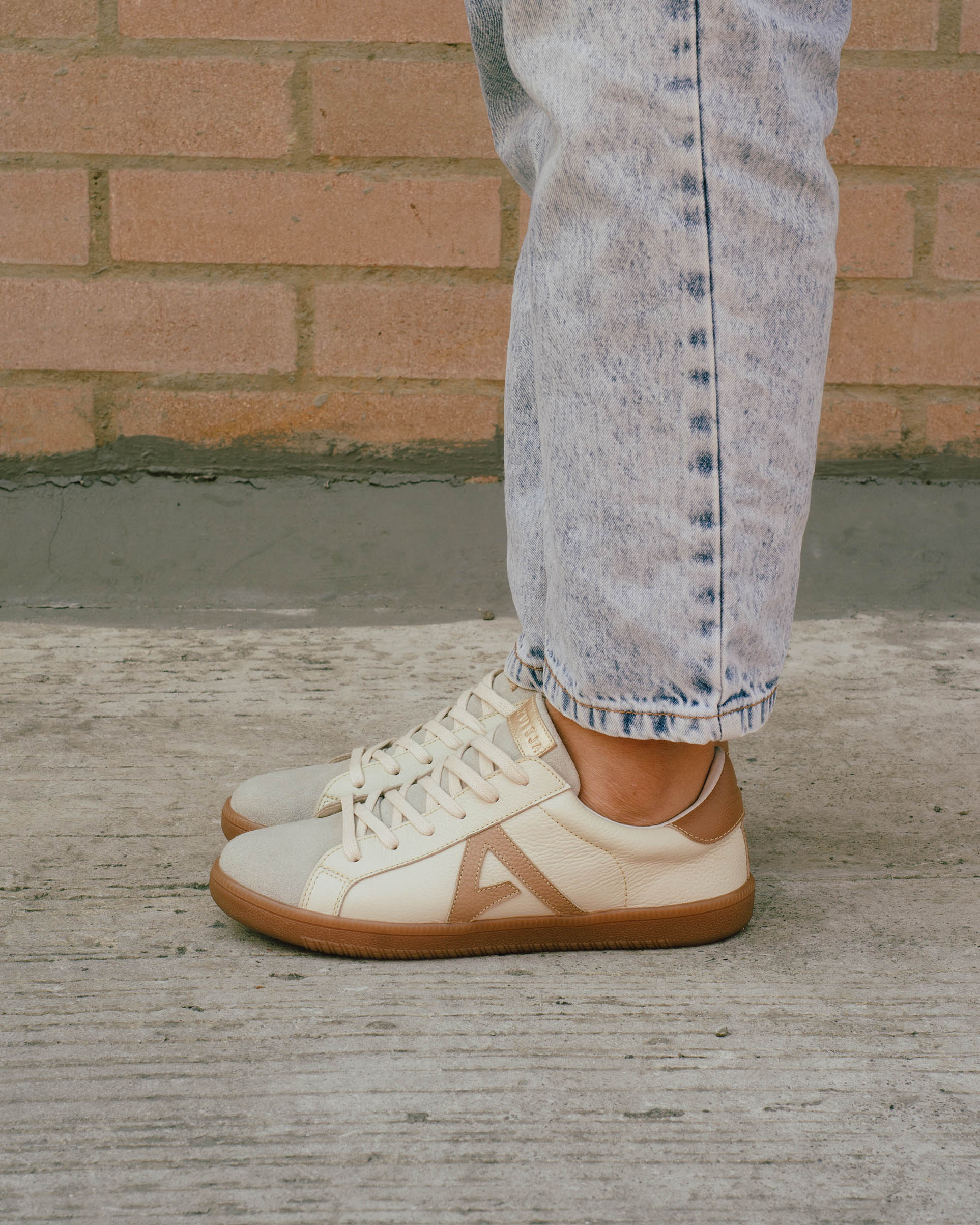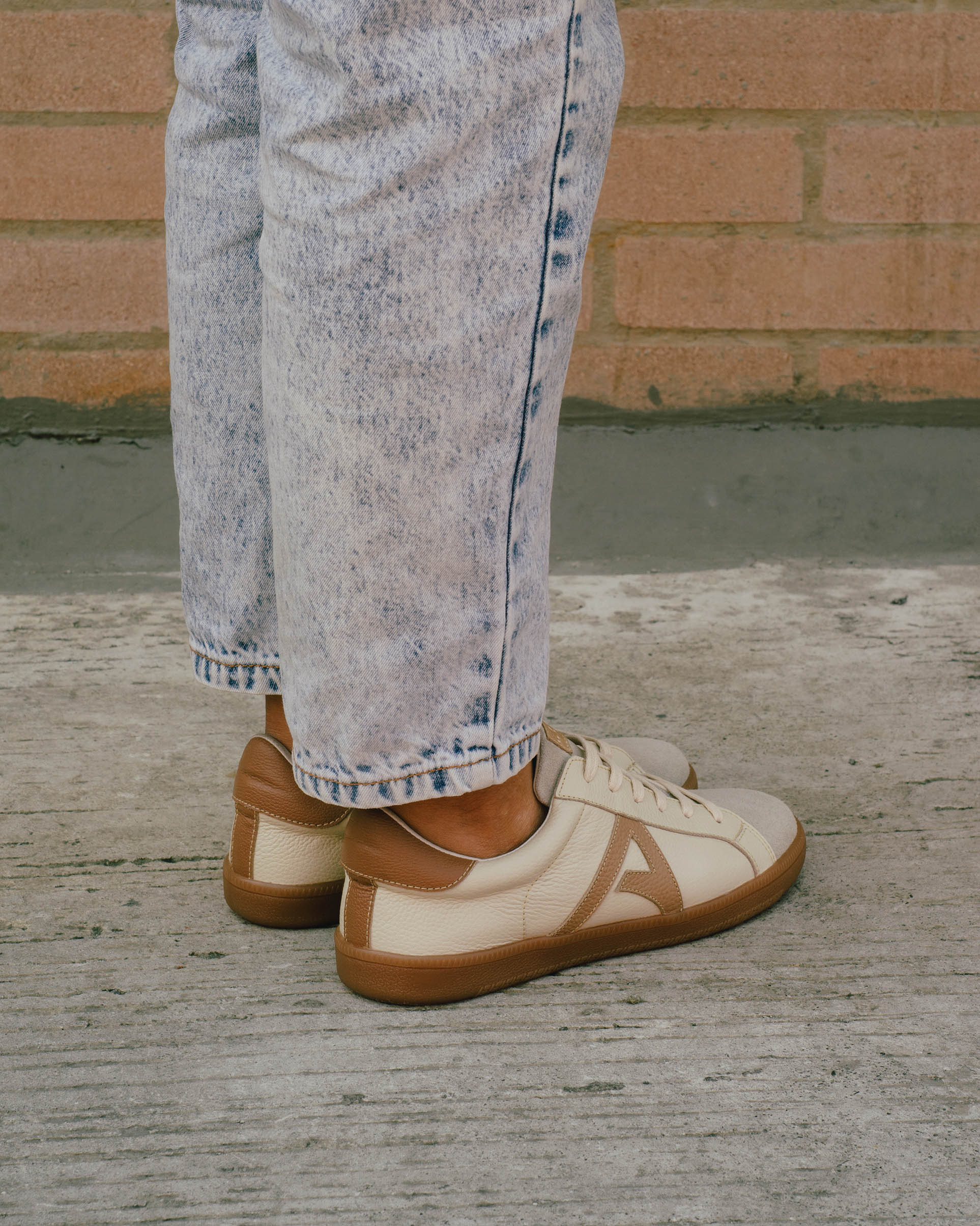 Iconic Vanilla Retro Un viaje directo a los 80’s y 90’s. Estos tenis en tono beige con punta en carnaza traen de vuelta lo clásico con un estilo que nunca pasa de moda. El lateral con la “A” de Azuleja le da ese sello único, los detalles en café y la suela color caramelo completan un atuendo vintage que combina perfecto.